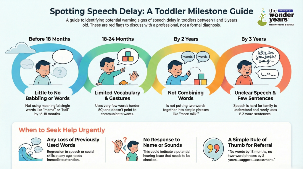 Certain missed milestones can suggest a possible speech delay in toddlers, especially between 1 and 3 years. These are warning signs, not a diagnosis, and any concern should be discussed with a pediatrician or speech‑language therapist.kidshealth